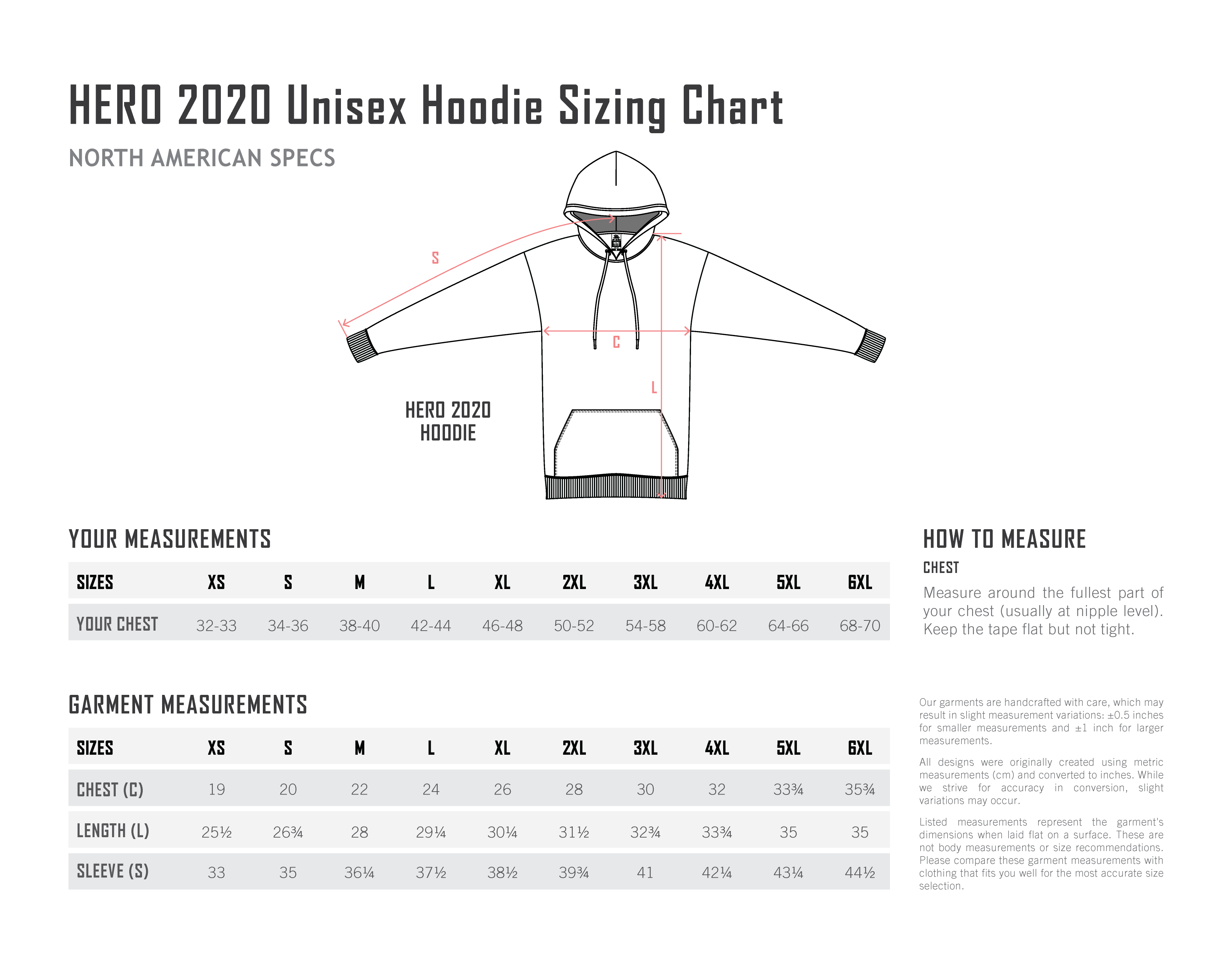 Chest (C) 19 in 20 in 22 in 24 in 26 in 28 in 30 in 32 in 33.75 in 35.75 in